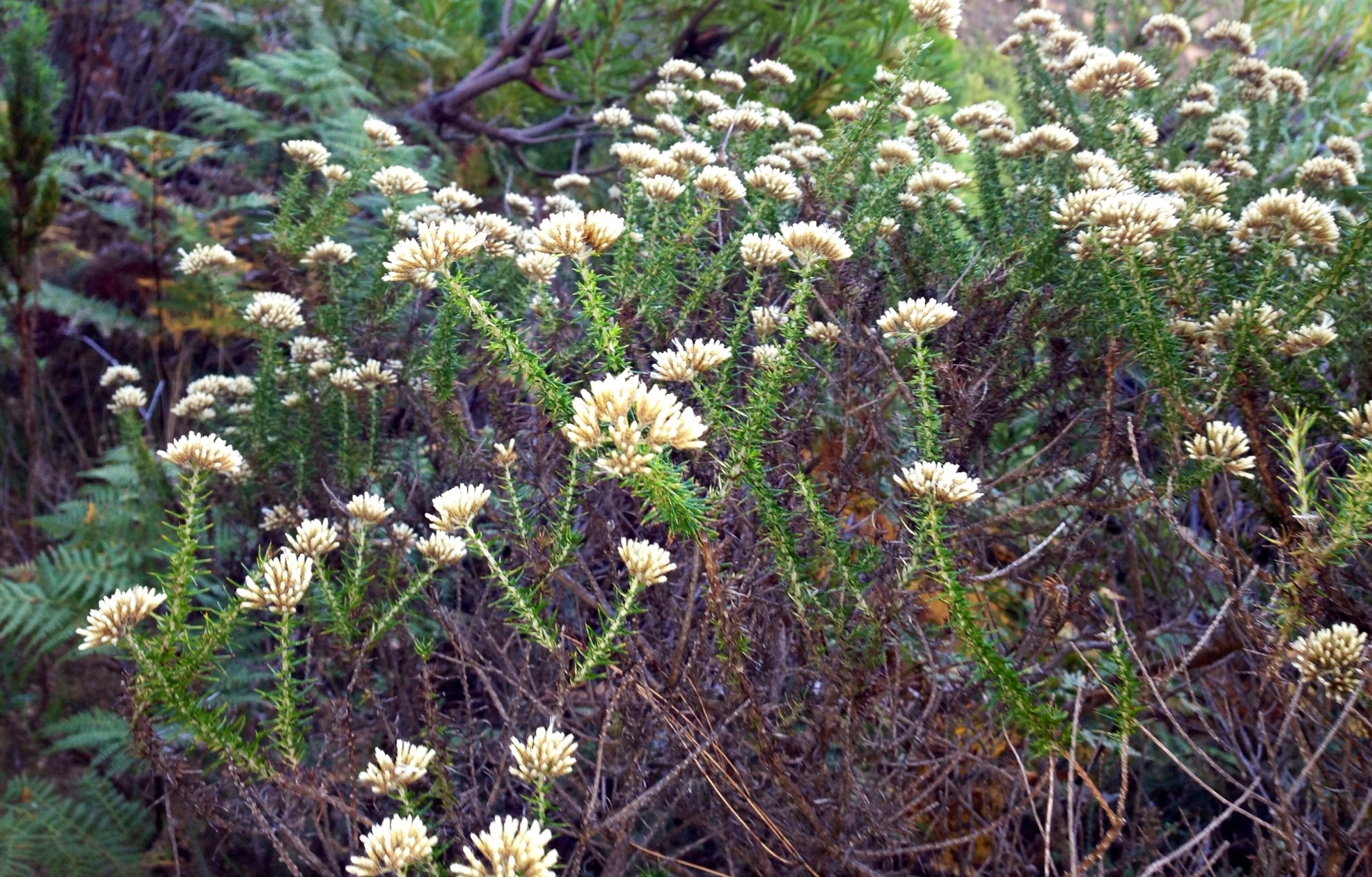 There is a multitude of shrubs on the farm with shapes that are unique and rather strange; not familiar to anyone who grew up in the herbaceous gardens of Europe, even those filled with exotic flora. A feature of these, and we’ll have lots of examples over the coming months, is that the leaves grow close to the stem, all the way up a long stalk, with the flower heads clustered at the top. One of these is Metalasia Densa, coming into flower now, – a prolific flowering which will last for the next six months. There are hundreds, if not thousands, of these shrubs on the farm.